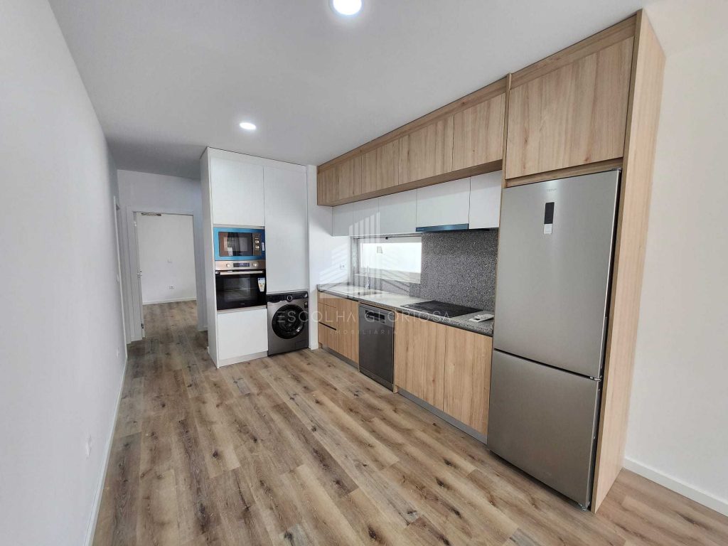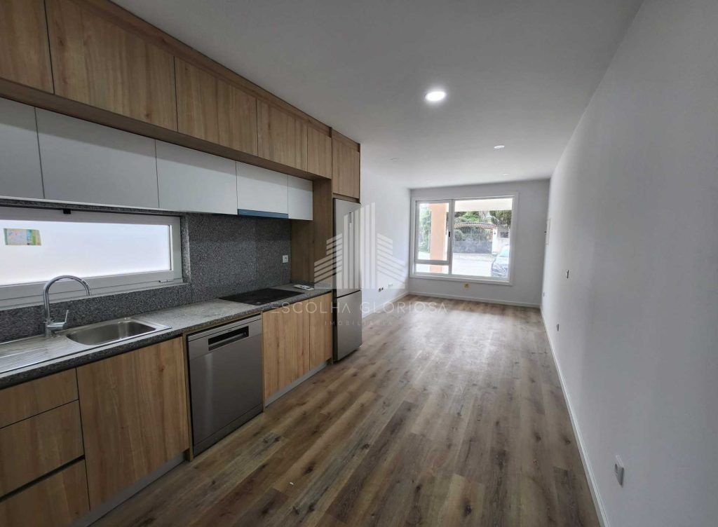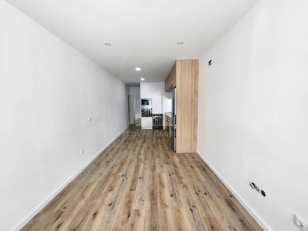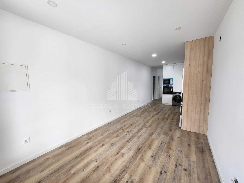 O imóvel é composto por um quarto com roupeiro, uma casa de banho moderna e completa, e uma cozinha em open space com a sala, criando um ambiente funcional, acolhedor e com excelente luminosidade natural.