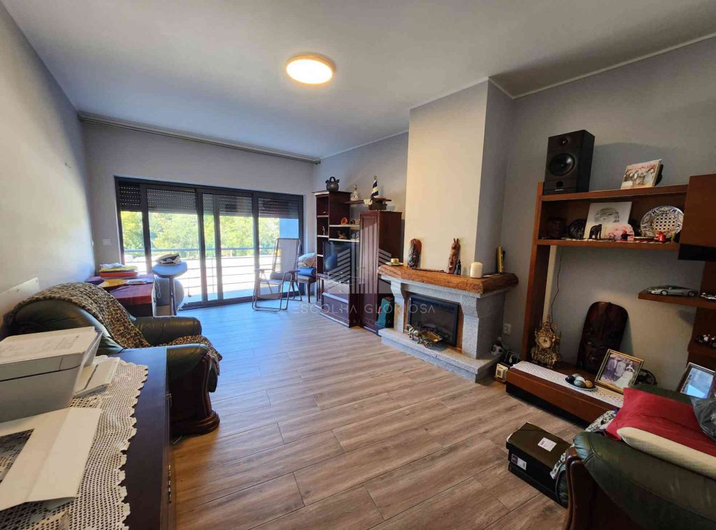 A sala de estar é ampla e acolhedora, equipada com uma lareira elétrica que proporciona um ambiente confortável e agradável nos dias mais frios. Da sala, é possível aceder a uma varanda, ideal para desfrutar de momentos de lazer ou simplesmente apreciar a vista deslumbrante.
